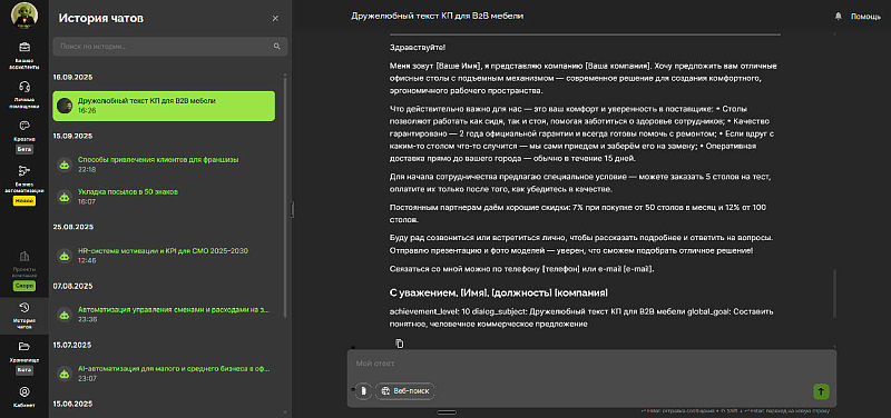 Наша специализация — прикладные ИИ ассистенты для операционных задач малого и среднего бизнеса: тексты, документы, ответы клиентам, аналитика.