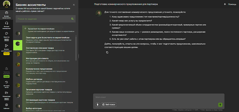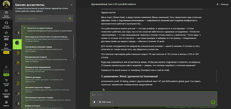 • Узкоспециализированный продукт для бизнеса, не для развлечения. Наша особенность — специализация именно под малый и средний бизнес. Такое сфокусированное позиционирование позволяет ориентироваться на достаточно обеспеченную аудиторию и легко продавать. Готовые ИИ-ассистенты закрывают рутину для малого и среднего бизнеса, не требуют промт-инженерии и сложных настроек, обновляются постоянно. Для вас все это снижает барьер входа и сокращает цикл сделки с конечным клиентом.