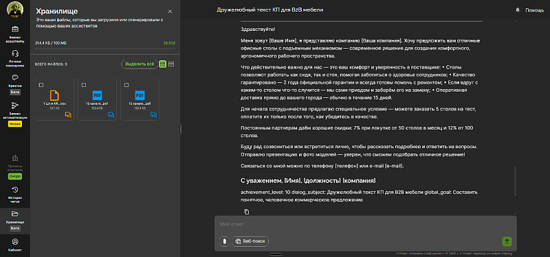 - Вести прозрачный документооборот напрямую с локализованным в России сервисом (чего не предоставляет ни один зарубежный ИИ-сервис).