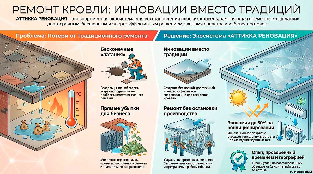 «АТТИККА РЕНОВАЦИЯ» — это не просто ремонт кровли, а технология восстановления гидроизоляции без демонтажа старого покрытия. Мы решаем проблему, с которой сталкиваются владельцы зданий и управляющие компании по всей стране: постоянные протечки, «латание» повреждений и большие затраты на ремонт и энергопотери.