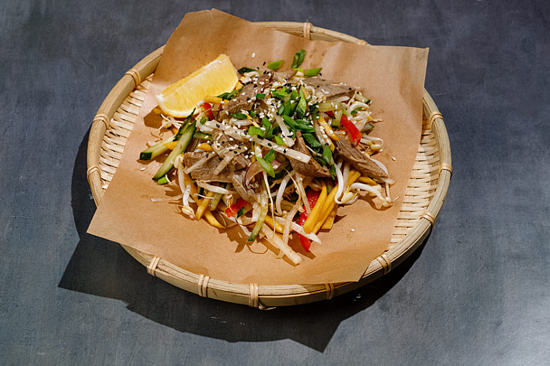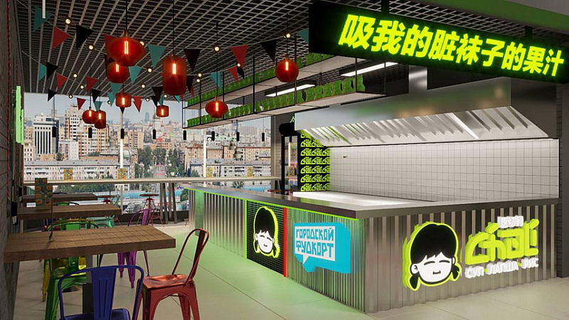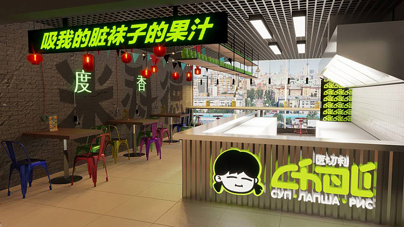 Яркий концептуальный дизайн, яркое меню с реальными фотографиями блюд, стандарты приготовления, яркая посуда, стилизованная форма сотрудников, мебель и элементы интерьера создают атмосферу китайской современной чуфаньки.