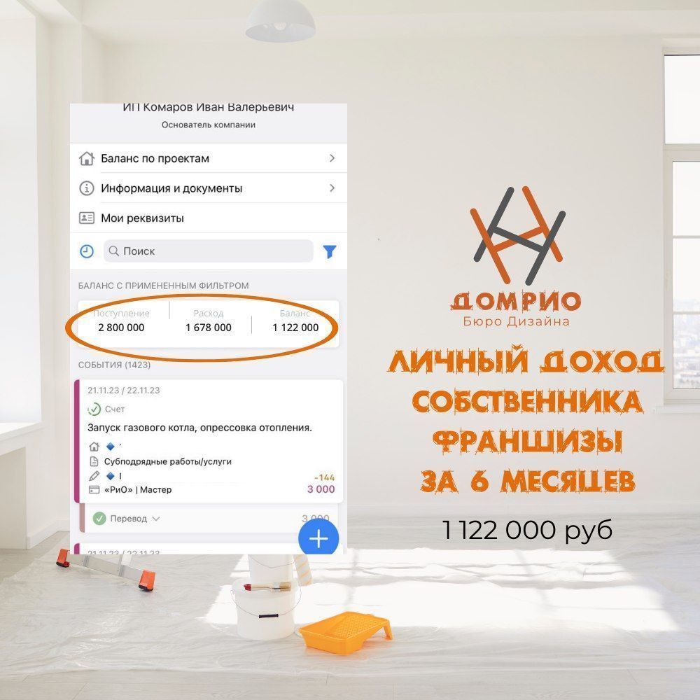 Вы будете работать по готовому набору правил и инструкций от франчайзера: как находить бригады, контролировать качество, считать расходы и общаться с клиентами. Мы берем на себя 90% всех задач: обучение, маркетинг, поддержку клиентов, сопровождение проектов и бюро дизайна. Франчайзи занимается привлечением заказчиков, заключением договоров и контролем за ходом работ. Через приложение «101» вы оперативно отслеживаете каждый этап ремонта, контролируете сроки и бюджет, наращивая прибыль уже с первых проектов.