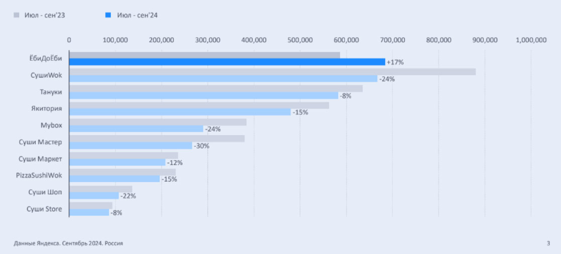 «Ёбидоёби» — единственный бренд среди всех доставок роллов в стране, который показал прирост по брендовым запросам на 17% с июля по сентябрь 2024 года по сравнению с тем же периодом 2023 года. «Ёбидоёби» ищут чаще других доставок суши и роллов в России.