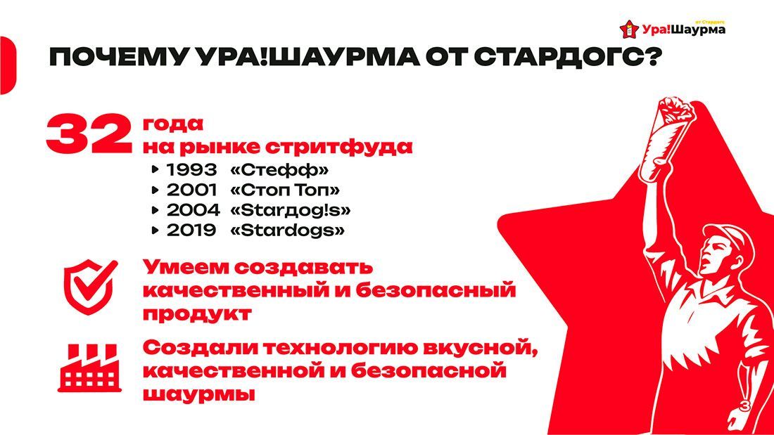«Ура! Шаурма» — это новый бренд от «Стардогс», лидера стритфуда (уличной еды) с хот-догами с 1992 года. Мы делаем вкусный, качественный и безопасный стритфуд (уличную еду) доступным для каждого жителя России.