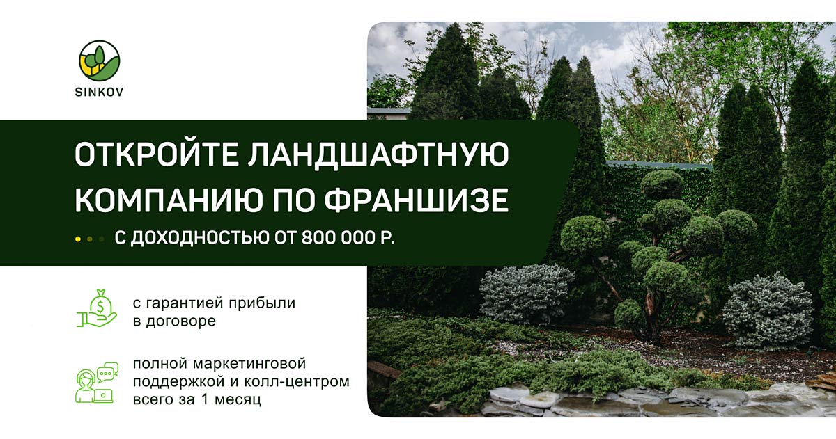 Франшиза SINKOV — это готовая бизнес-модель в сфере ландшафтного проектирования и комплексной реализации объектов. Партнеру предоставляются пошаговые инструкции, наставничество, база проектов, маркетинговая поддержка, ERP-система и обучение.