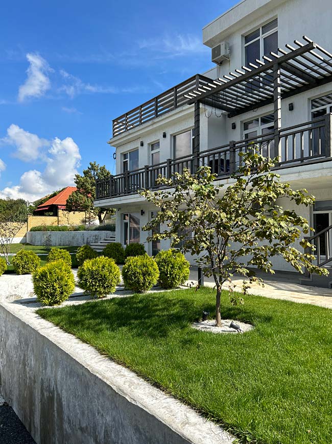- Реализация под ключ — земляные работы, мощение, посадка растений, устройство водоемов, освещение, автополив.