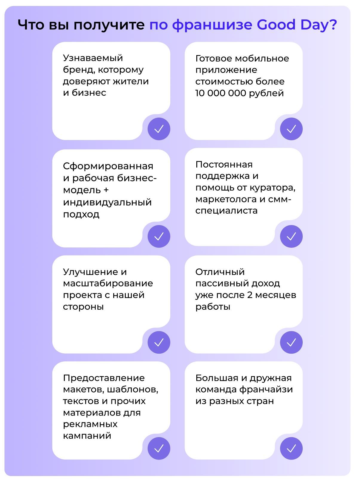 Good Day — это понятный городской сервис с мобильным приложением, который можно запустить и развивать в своем городе по готовой системе. Вы получаете рабочий продукт, поддержку команды и четкую модель заработка без необходимости разбираться в IT. Проект подходит тем, кто хочет начать бизнес с минимальными рисками и понятными шагами.