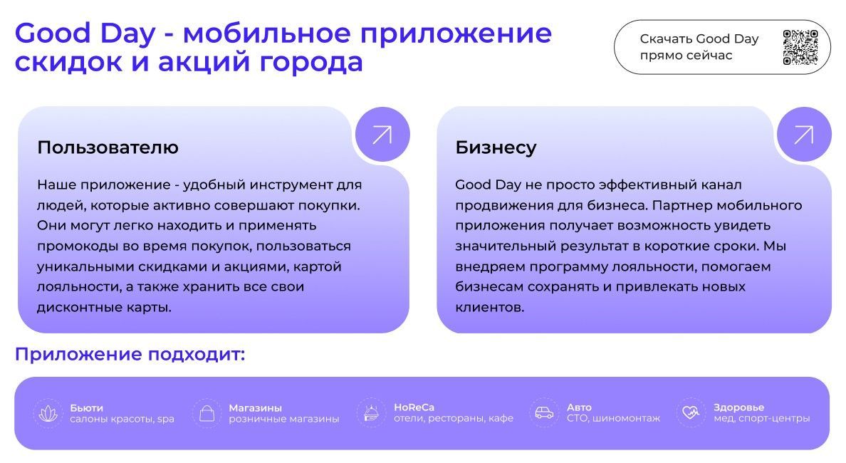 Good Day — это франшиза городского digital-сервиса скидок и выгод с собственным мобильным приложением и сайтом.