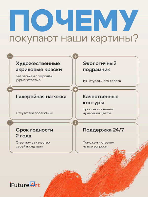 iFutureArt — лидер на рынке товаров для творчества с глубокой экспертизой в производстве картин по номерам. В 2024 году мы запустили собственное производство в Казани, что позволило: