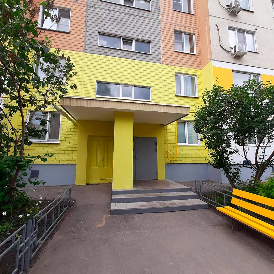 - Благоустройство внутридомовой территории, укладка обрезиненного покрытия, установка скамеек, урн, детских, спортивных элементов.