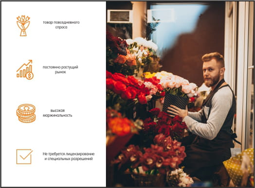 Выверенная ассортиментная матрица и специальная собственная система автоматизации, дающая высокий показатель оборота с 1 кв. м торговой площади цветочного магазина. - Регулярная поддержка после открытия