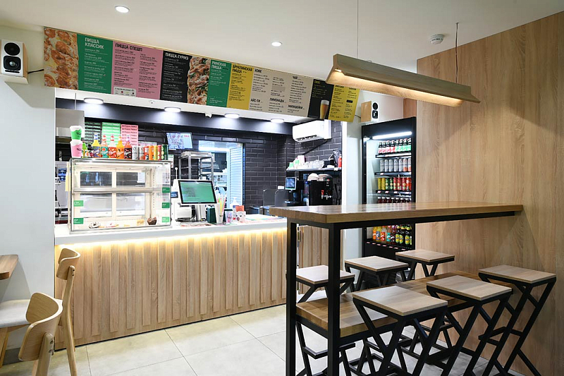 - Преимущества — небольшая арендуемая площадь с максимальной производительностью и минимальным количеством посадочных мест для быстрого перекуса и возможностью самовывоза.